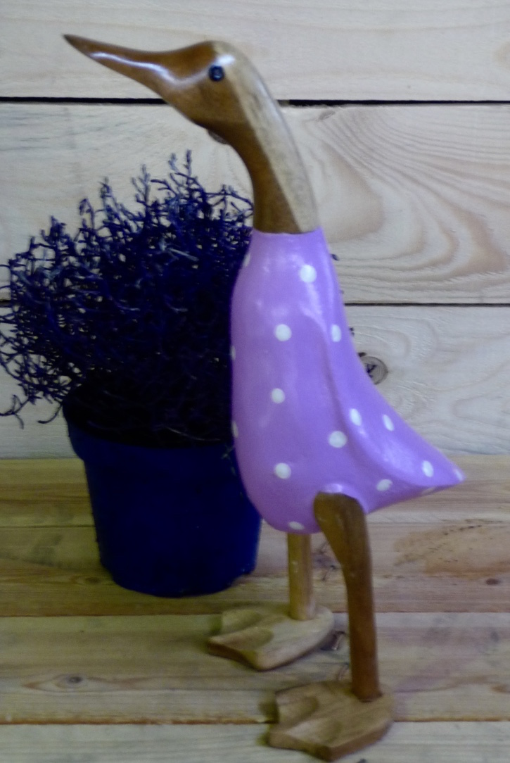 Wir verkaufen hier eine süße lila Ente mit weißen Tupfen für drinnen und draußen. Der Kopf und die Füße sind aus Teakholz, der Körper besteht aus einer Bambuswurzel.